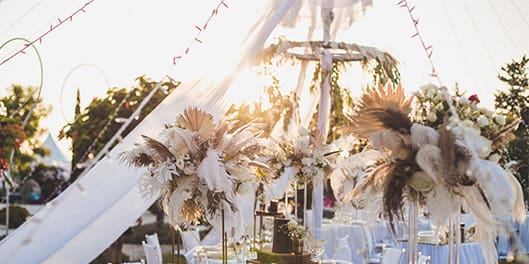 Boho Crystal, is a combination of dried flowers, such as Pampas Grass, paired with Ostrich feathers & superior quality of Fresh flowers like Hydrangea & Lavender, so that they decorate your banquet tables at The Cupule. The arrangements are complemented by tall crystal vases, creating an upper decoration layer. The lower level is created with colored candles to match your color palette, Crystal candleholders and fresh posies of Mini Roses and Lysianthus, together they create an ethereal fantasy tablescape.