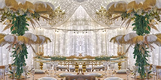 Golden Boho Chic , is a combination of dried flowers, such as Pampas Grass, paired with superior quality of Silk flowers & Ostrich feathers so that they decorate your banquet tables at The Cupule. The arrangements are complemented by tall Gold vases, creating an upper decoration layer. The lower level is created with earth toned candles, tree slices and gold candleholders and fresh posies of Mini Roses and Lysianthus, together they create an ethereal fantasy tablescape.