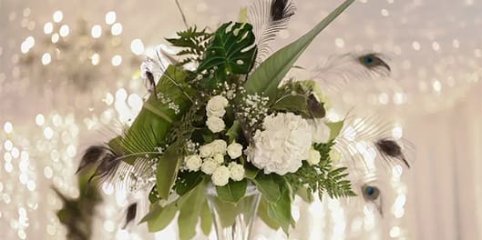 4 Banquet Fresh flower arrangements which consist of 30 fresh flowers per arrangement (60 Cm Diameter) Banana Leaves, Peacock Feathers and Tropical Greenery