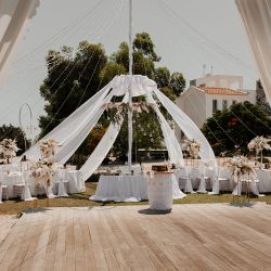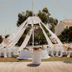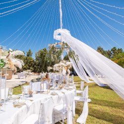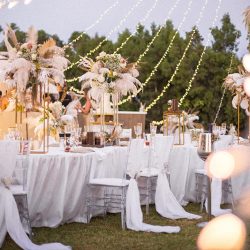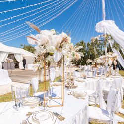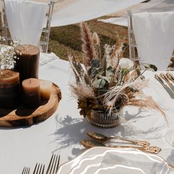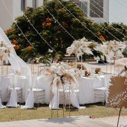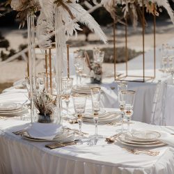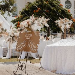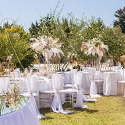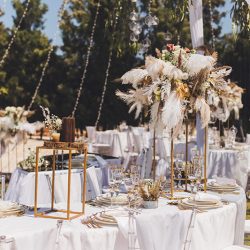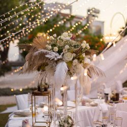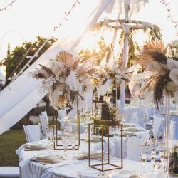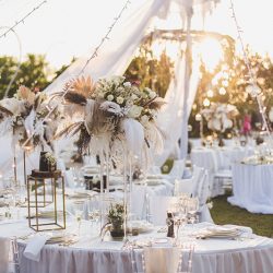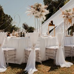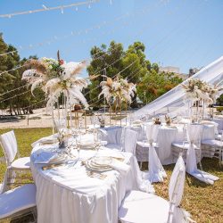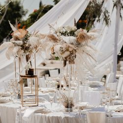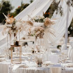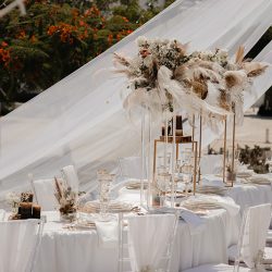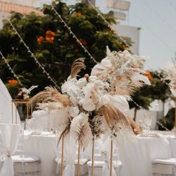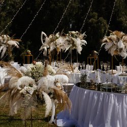 - 4 Banquet Fresh flower arrangements which consist of 30 fresh flowers per arrangement (60 Cm Diameter) Ostrich Plumes and dried Boho elements