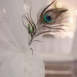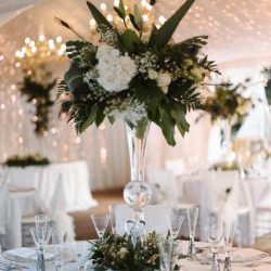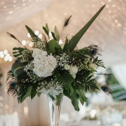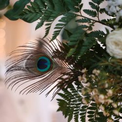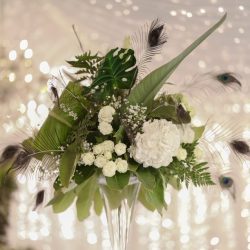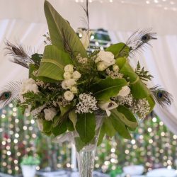 - 4 Banquet Fresh flower arrangements which consist of 30 fresh flowers per arrangement (60 Cm Diameter) Banana Leaves, Peacock Feathers and Tropical Greenery
