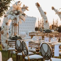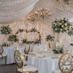 - Crystal Glass top Gold Banquet tables with Encrusted jewel sides are included in this package or tables are Round or ‘S’ Shaped and long banquet with tablecloths & Underskirts or wooden.