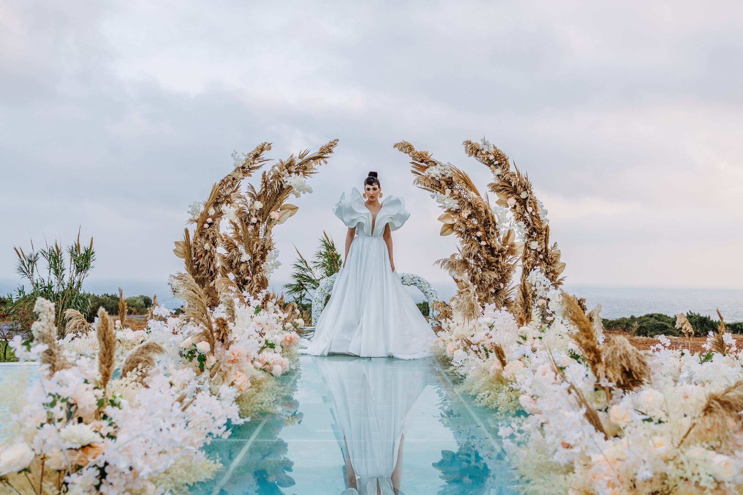 Float into a Bohemian dreamscape. This is a statement ceremony set up, on the pool. Walk on water and allow the God and Goddess within you to shine on the most significant walk you will ever do highlighted by the breathtaking boho Meniscus arches…