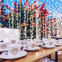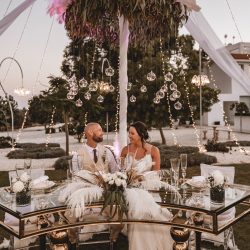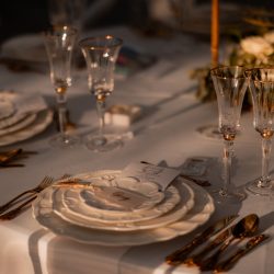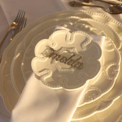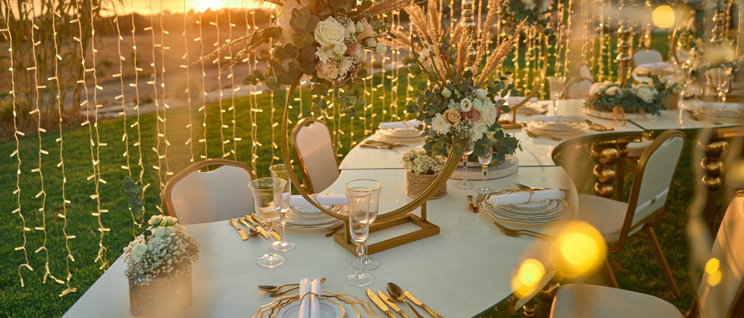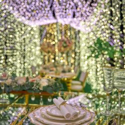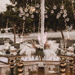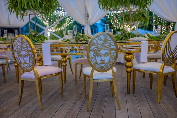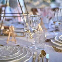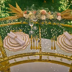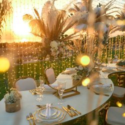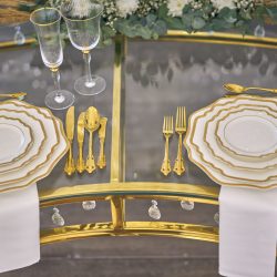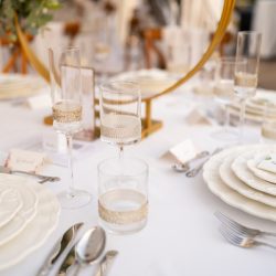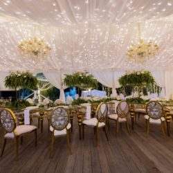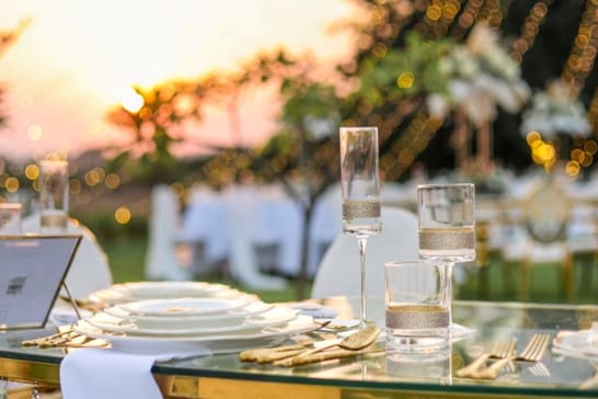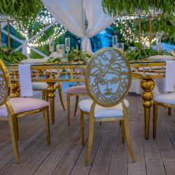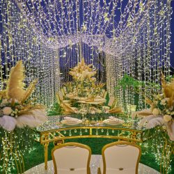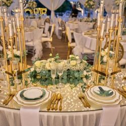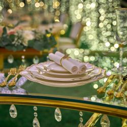 Full on Glamour with the Premium package, Crystal glass tables with encrusted gems in the border, The White & Gold Versace banquet chair, Crystal Embedded ‘s’ tables, Fine bone China 24 K rimmed, decorative Charger plates and 24 K Gold Crystal glasses..