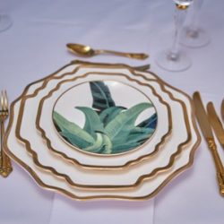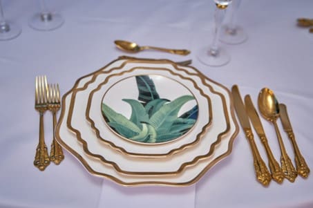 - Bone China plating or Bone China with 24 K gold rim side plates, cake plates, and dessert plates (For Full Banquet Set-Up).