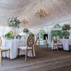 - Tables are Round or ‘S’ Shaped and long banquet with tablecloths & Underskirts or wooden.